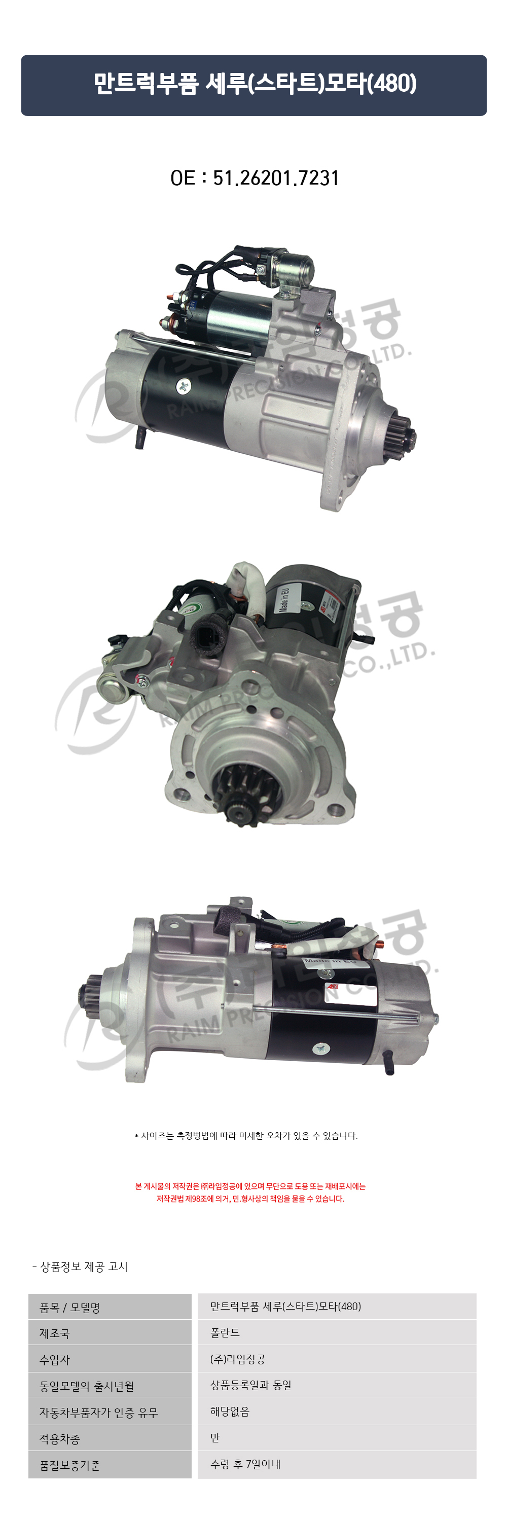 만트럭부품 세루(스타트)모타(480) (OE : 51.26201.7231)
